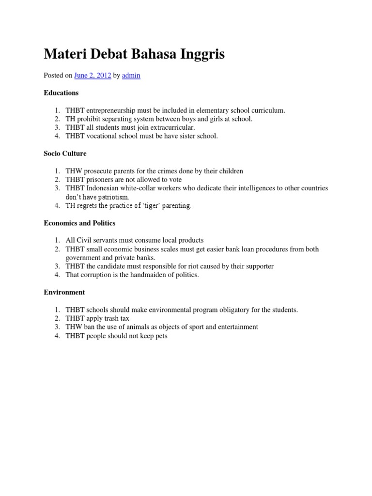 Pengertian Teks Debat Menurut KBBI debat dapat diartikan sebagai pembahasan dan pertukaran pendapat tentang suatu hal dengan saling memberi alasan untuk mempertahankan pendapat. Thanks for the time that given to us to participate in the debate English contest were from SMP 1 Lasem and now let us introduce our team. Teks Debat Singkat Dalam suatu pendapat akan selalu ditemui pro dan kontra antara satu individu dengan individu yang lainnya berawal dari pendapat yang kecil atau sederhana bahkan pendapat yang bersifat konkrit.